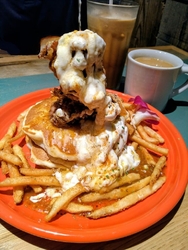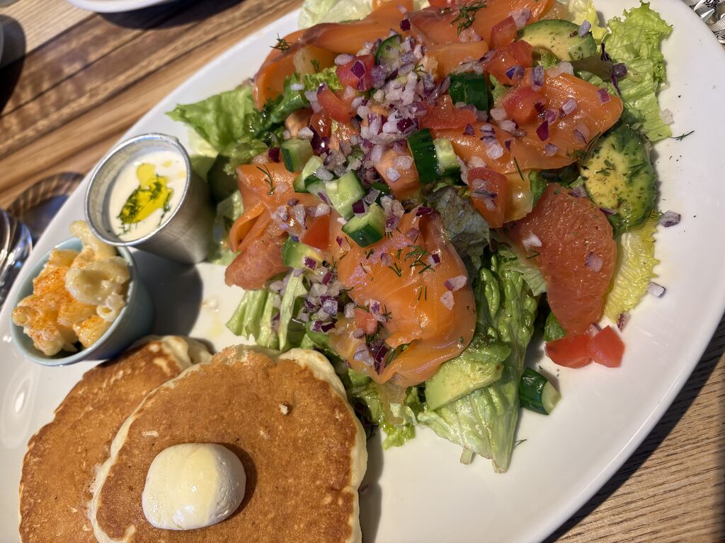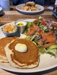 娘を駅に送りがてら、どこかでランチしようということで候補を出したところ、娘の希望で3度目の来店。今日は期間限定商品推しだったようで、娘は「チーズホワイトポルチーニロコモコ」を注文。私はロコモコというと目玉焼きのイメージですが、ふわふわオムレツの上にハンバーグ、その上にチェダーチーズ、クリームソースはポルチーニがたっぷり!少し分けてもらいましたが、ポルチーニの風味がたまりません!めちゃウマです☆私はサーモンサラダパンケーキを注文。スモークサーモンにたっぷりのサラダ、グレープフルーツ2種類がいい感じでさわやかさをプラス!パンケーキも食べられて満足間違いなし!今日は時間もあったので食事してすぐに退店でしたが、コーヒーも美味しかったし娘も喜んでいて嬉しかったです♪ごちそうさまでした~! (訪問:2025/12/15)