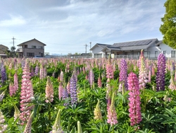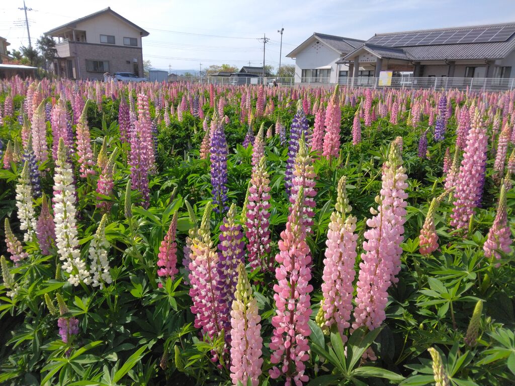 国府公民館の南側の畑では、色とりどりのルピナスが咲き誇り、地域の環境美化と伝統文化の継承を象徴してます。住民の手で守られたこの景観は、訪れる人々に自然の豊かさと地域の絆の大切さを伝えています。