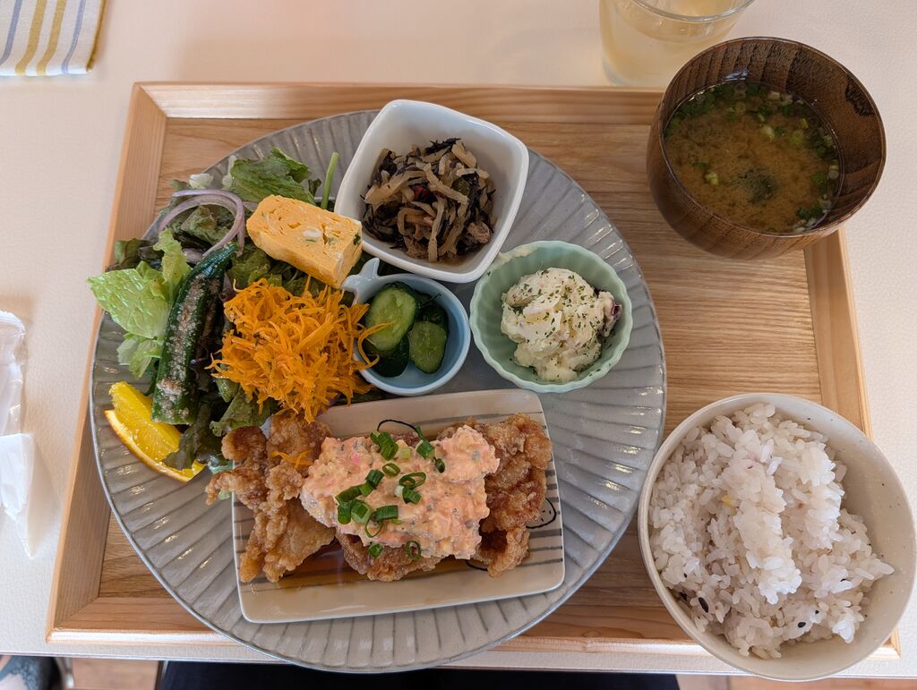 ランチで初めて利用しました。チキン南蛮を食べたのですが、サラダや副菜、ごはんにお味噌汁などもついていてとてもボリュームがあり、きれいに盛り付けられていて目でも楽しめました。デザートにアフォガードもいただきました。2種類のアイスでとても贅沢でした。気になるメニューがいくつかあったので、次回は家族で伺いたいです。 (訪問:2025/10/30)