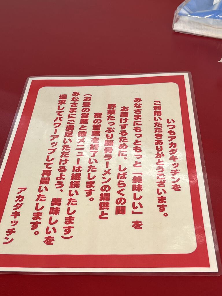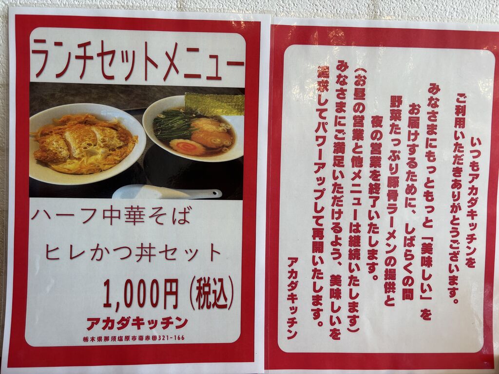 オープン以来ずっと気になっていたアカダキッチンさん。ようやく暖かくなってきたので、県北方面へのサイクリングがてら訪問しました。来てみたかった一番の理由はG系ラーメンでしたが、現在は提供していないようで少し残念。ただ、営業はランチのみながら定食や醤油ラーメンなど魅力的なメニューが揃っていて、しかもどれも1000円以内と良心的な価格設定です。悩んだ末に注文したのは、ヒレカツ丼とハーフラーメンのランチセット。カツ丼単品でも1000円前後が相場な中で、ラーメンまで付いてちょうど1000円というコスパの良さに驚きました。味も大満足。ラーメンは王道の鶏ガラベースで、キリッとした醤油スープが心地よく、どこかホッとする美味しさ。ヒレカツはお肉が柔らかく、こちらもクオリティが高いです。気づけば夢中で完食していました。他のお客さんが注文していた鉄板焼きのホルモンや豚バラもとても美味しそうで気になりますし、やはりG系ラーメンも一度食べてみたいところ。ぜひ復活してほしいですね。また食べに来たいと思います。ごちそうさまでした! (訪問:2026/04/06)