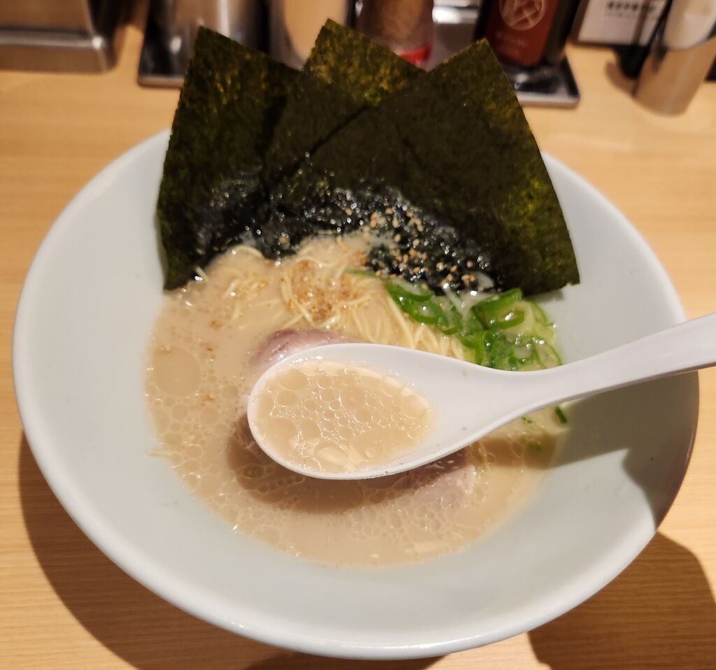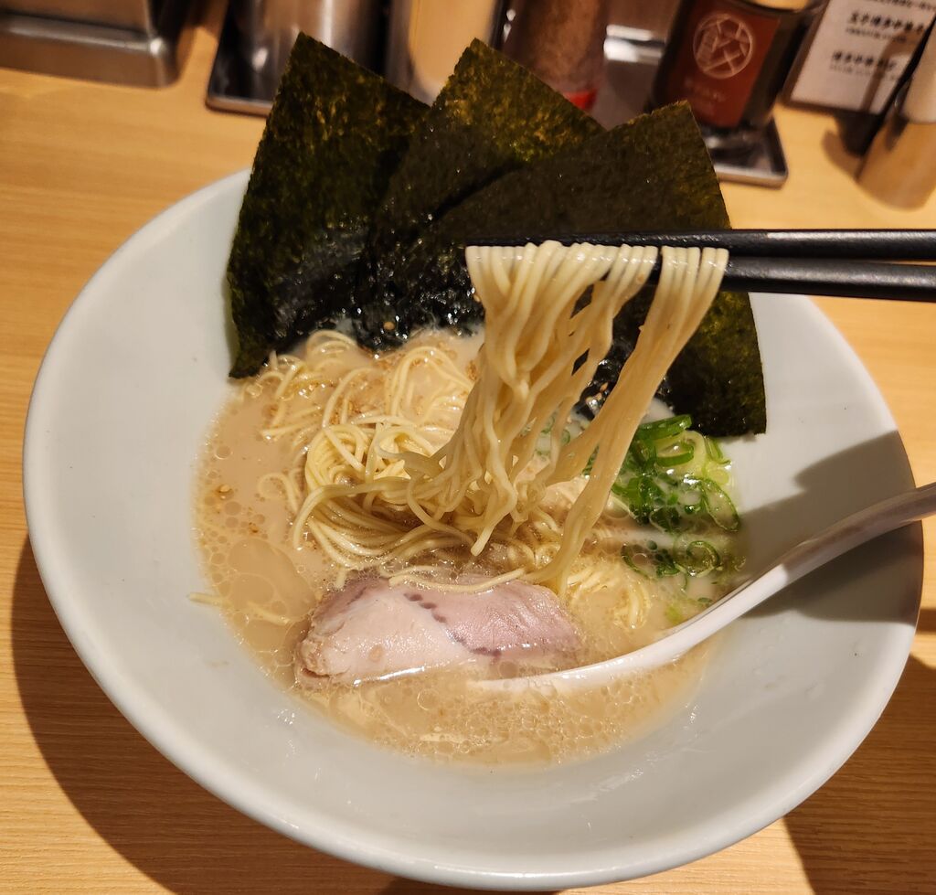 駅東の居酒屋で呑んだのであがりに豚骨ラーメン。オープン日以来の訪問になります。注文は「白丸シンプル 790円」「トッピングのり 140円」おつまみでお腹一杯でしたがラーメンは別腹。好みのバリカタ麺にして美味しかったです。 (訪問:2025/10/24)