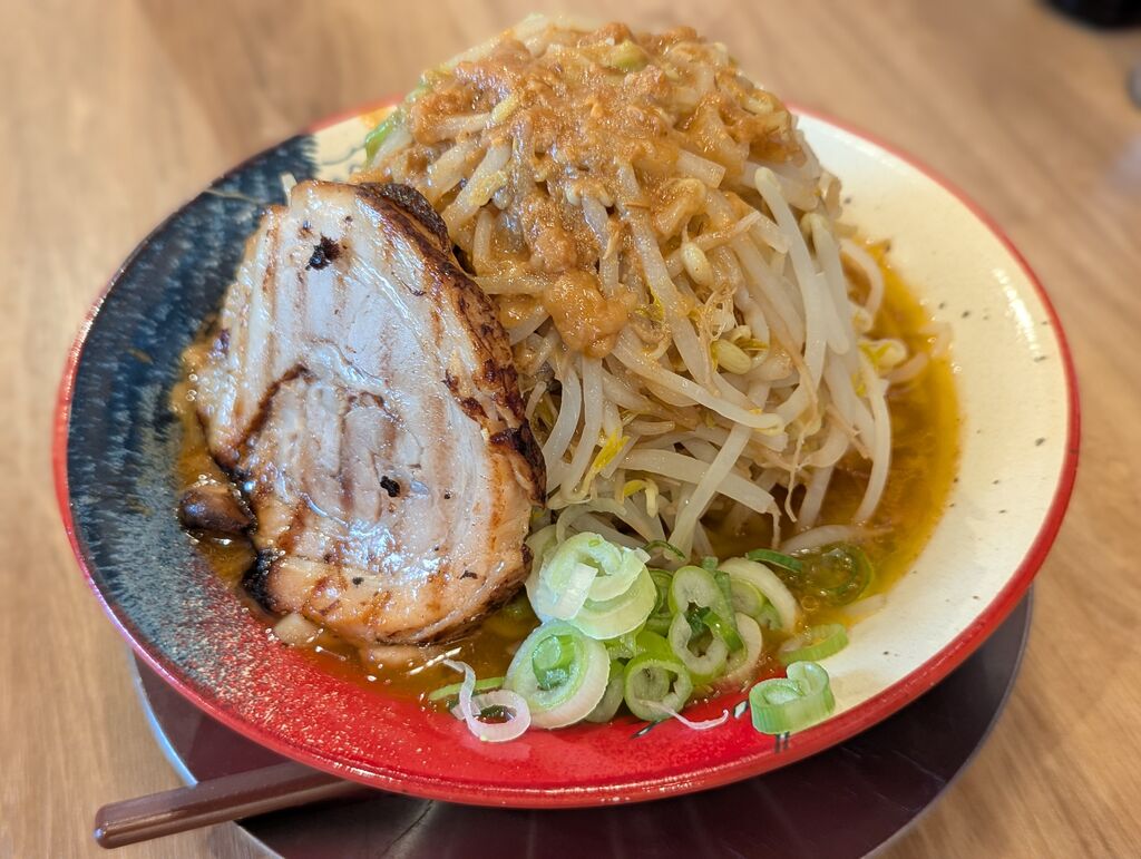 NEW味噌ラーメンが食べたくて来店しました。中休みがなく営業しているので助かります。タブレットからの注文でG系タイプのラーメン【味噌二郎】を注文。山盛りのモヤシに厚切りチャーシューに極太麵で食べ応えがありました。定食類もありましたので、次回は食べてみようと思いいます。 (訪問:2025/10/20)