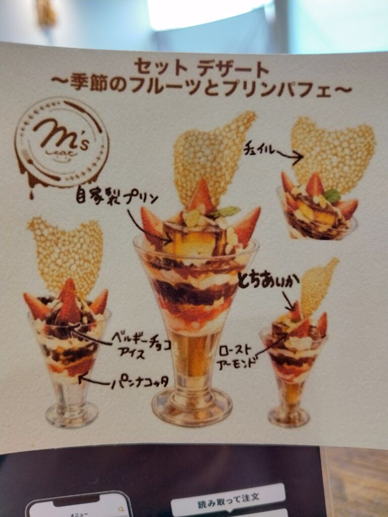 久々に休暇を取り2025年6月にオープンした『m´s eat』さんに初ランチ。ずっと気になっていたお店です。メニューは⚫6種のスープ付前菜+4種のメイン料理から1つ+ドリンク・・2,420円 ⚫6種のスープ付前菜+4種のメイン料理から1つ+ドリンク+パフェ・・2,860円 の2種類。私はパフェ付きを注文。まず前菜はとても繊細でどれだけ手間をかけたのだろうと思えるもの。食材も多種使用しておられ感動しました。サラダのドレッシングはやみつきになる味わいで販売用を購入しました。メインはハンバーグ・オムライス・カレー・グラタンから選べます。私はハンバーグを注文。ジュージュー音をたてた出来たてが運ばれてきます。鉄板が熱々なので少々レアな部分を自分好みに熱を加えていきます。ハンバーグは肉々しく肉汁たっぷり。The 肉でした。連れはオムライスをチョイス。オムレツはふわとろ。デミグラスソースとの相性もバッチリです。パフェは手作りのとろけるプリンに季節の果物が入ったパフェです。最初から最後まで大満足のランチタイムでした。 (訪問:2026/03/06)