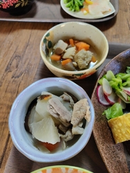 友人4人でランチに伺いました。民家を改装したという落ち着いた雰囲気です。本日の定食は、野菜の豚肉巻。メインのプレートには肉巻き、たっぷりの野菜サラダ、卵焼き、サツマイモサラダ。そこにもつ煮、根菜と鶏肉の煮物の小鉢、浅漬け、ご飯、スープ。どれも家庭的な優しい味付けで、野菜たっぷりのいろんな味付けのお惣菜がいただけました。デザートのこだわりコーヒーもとても美味しかったです。 (訪問:2025/12/17)