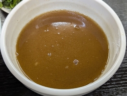 久しぶりに家系ラーメンが食べたくなりお邪魔しました。券売機を左上から順番に見ていくと【魚介豚骨つけ麺】を発見。魚介もご無沙汰していたので、気持ちがつけ麺に変更になり魚介豚骨つけ麺を注文しました。チャーシュー、ほうれん草、メンマ、ネギは別皿で自分のタイミングでスープに入れられるので良いですね。卓上に魚粉とおろしニンニクも設置されているので、途中で味変も可能です。濃厚な魚介のスープが絡む太麺も美味しい~平日の昼間からニンニク全開でした(笑)ごちそうさまでした。 (訪問:2025/10/04)