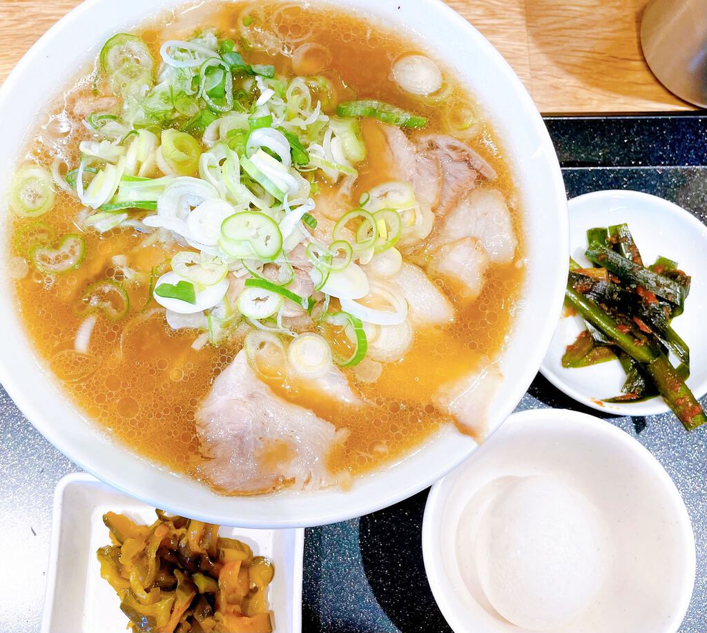 初めて2人でランチ訪問しました。券売機で太旨ラーメン880円を、並盛り、味薄めで。トレイを持って並ぶと麺が出来て、ネギは盛り放題、卵、漬物を取ってテーブル席に。ライスはどうすれば貰えるのか聞くと最初はライスは、券売機で購入との事。150円払って再び並びお茶碗を頂き、ライスも無事確保出来ました。お茶碗貰える場所は麺の所で、その場所には、次回は代金がかからないライスの無料券が置いて有るので一枚頂きました。ライスの無料券には有効期限が有ります。慣れないのですが食べるまでに、ちょっと時間がかかりましたが、麺は極太で幅も1センチ以上あったりする縮れでスープの絡みも良く啜るより噛み締める美味しい麺でした。ご飯に卵をかけ、ニンニクなどスパイスが沢山有るので、色々試しながら味変も楽しみました。清潔感に溢れスタッフの皆さん凄く感じが良く居心地も良かったです。初めてで戸惑いながらのランチになりましたが、また行きたくなるお店でした。 (訪問:2025/11/10)