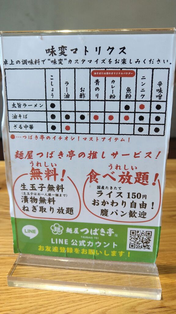 オススメしたいポイントが沢山です^_^安い・早い・美味い♡に加え、AM11時までの来店でライスの提供が無料なんです。AM10時30分頃初来店。主人は嬉しそうにライスをいただいていました。『卵・お新香』も無料。卵はひとりひとつ。ネギはお好きなだけどうぞ(笑)私は、ネギ大好きなので大量に乗せました。ラーメンは¥880とリーズナブル。モッチモチ麺の多加水麺です。幅広い麺も入っていました( ˘ ³˘)また行きたい【つばき亭】さん。オススメです。 (訪問:2025/11/24)