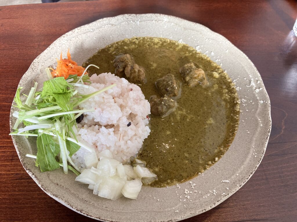 日曜日のお昼ごはんをいただきに、神様と一緒に伺いました。ちょうどお昼時だったせいか、駐車場は車がいっぱい。お店の中もたくさんのお客さんで賑わっていました。サグカレーが大好きという神様は、12月の限定メニュー「サグポークカレー1200円」を注文。私はサグカレーと特製チキンカレーの「2種あい盛りカレー1300円」をお願いしました。SNSを拝見していたので、もじもじしながらも合言葉を伝え「自家製ノンアルホットワイン」をサービスでいただきました。お客さんはたくさんでしたが、カレーの提供は早い~。席について、ほっと一息ついたかと思ったら、すぐに運ばれてきました。2種盛りカレーは、緑と赤でクリスマスカラーです。まずは、サグカレーの方から。ぴりりと効いたスパイスの他に、ほうれん草の旨味とチーズのコクがたまりません。あとからじんわりと辛味が押し寄せてきて、結構辛さも感じました。サグカレーはマイルドなイメージでしたが、スパイシーでも美味しですね。特製チキンカレーも安定の美味しさ。あっという間に完食です。食後にホットワインをいただきました。甘くて美味しくて、お代わりしたくなっちゃいました。店内には大きなクリスマスツリーが飾られていて、なんだかワクワクした気持ちになれました。もう一回サグカレーを食べに来れたらいいな。美味しい幸せをありがとうございました。ごちそうさまでした~。 (訪問:2025/12/07)