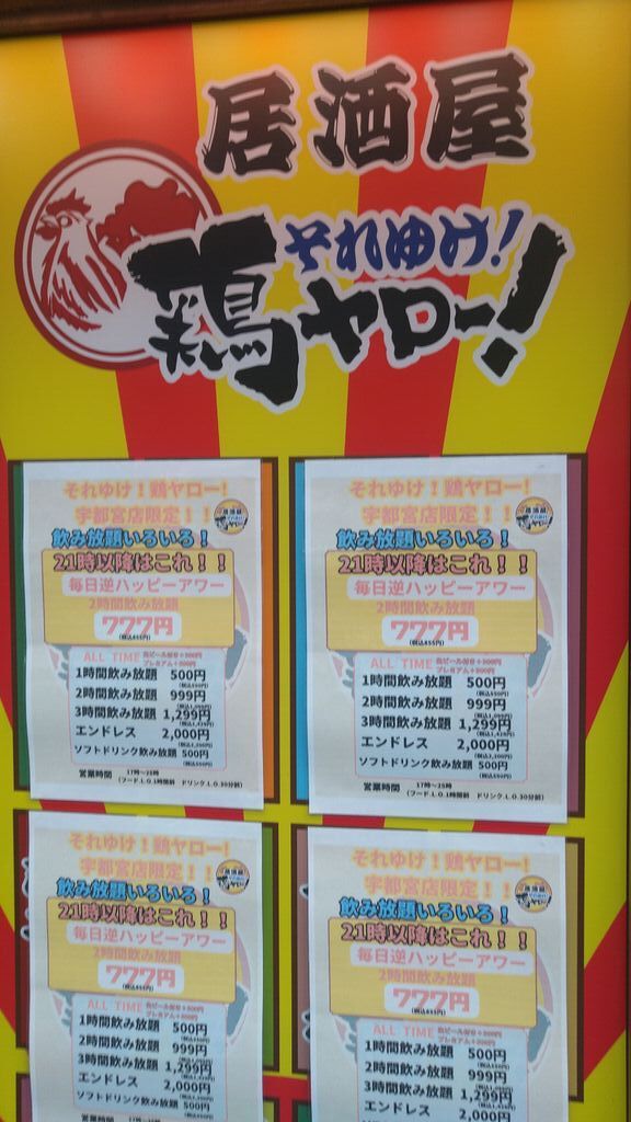レモンサワー激安、唐揚げは名物の「和田ちゃん唐揚げ」!東武宇都宮駅近で、コスパ最強の鶏料理とお酒が楽しめる居酒屋【それゆけ!鶏ヤロー!】。賑やかでレトロなお祭り空間で、仲間とワイワイ盛り上がろう!飲み放題も激安で大満足間違いなし!