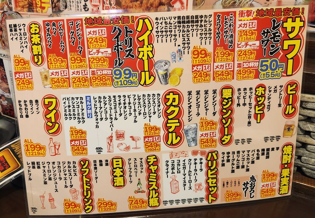 首都圏を中心に80店舗以上展開しているとてもリーズナブルな居酒屋です。2025年3月16日にオープンしたこちらのお店、大通り沿いにあり、ド派手な看板でかなり目立っています。お酒50円~、料理99円~!、おつまみは109円からとかなりお安いです。お通しは、えびせん、枝豆などから選べます。えびせんは食べ放題とのことです。QRコードで注文します。飲み放題もかなりお安く、料理も飲み物も提供が早かったです。また、店員さんがとても優しくて、楽しい時間をすごせました。東武宇都宮線東武宇都宮駅東口より徒歩約5分、関東自動車のバス停県庁前のすぐそばで立地がとてもよいです。カウンター席もあり、一人でも入りやすいので、また伺いたいです。 (訪問:2025/07/13)