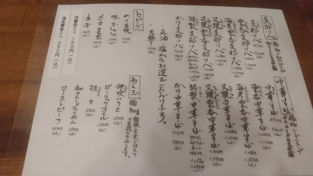 支那そばは鶏・豚と和の合わせスープの細ストレート麺、中華そばは鶏・豚スープの中太手もみ麺です。今回は支那そばと餃子セットを注文しました。支那そばのスープは見た目とは違い、濃くなくさっぱり美味しく頂きました。チャーシュー、メンマも柔らかくて美味しかったです。次回は雲呑入りや塩スープで食べてみたくなりました。 (訪問:2025/09/11)
