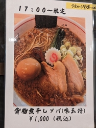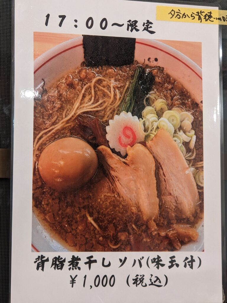 初来店です。中華そば(税込960円)をいただきました。鶏と豚のシンプルスープながらも旨味濃厚、麺は太麺で食べ応えがありました。家族はワンタンが入った中華そば、17時から限定の背脂煮干しソバ(味玉付)を注文。こちらも美味しかったです。店内は小上がり席や座敷もありました。 (訪問:2026/01/24)