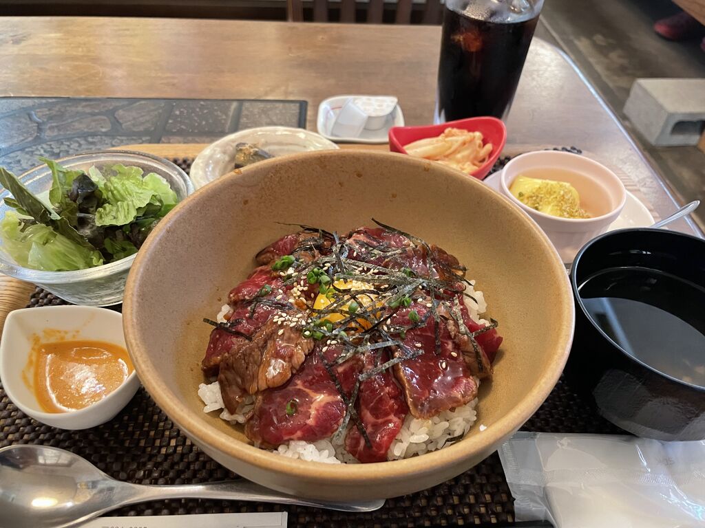栃ナビさんで新規登録されて、気になり、那珂川町までランチで遠征。メニューが豊富でどれも美味しそう。今日は牛たたき丼。旨味たっぷりの牛肉。卵黄を崩して食べるとユッケの様。ご飯の盛りも良くてボリューム有り。サラダ、小鉢、デザート、飲み物まで付いて1,300円。コスパも良くて、旨し。他のメニューもトライします^_^ (訪問:2025/09/17)