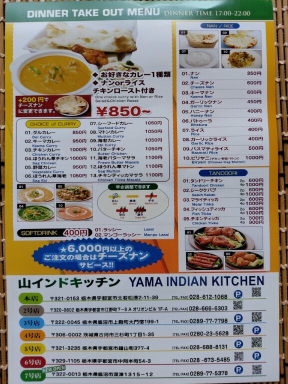 「山インドキッチン」さんが鹿沼インター通りにオープンしたのでランチに、ほうれん草とチキンのカレーをテイクアウトしてきました。以前から栃ナビで、他店舗の皆さんの口コミを読み、行ってみたいと思いつつもなかなか行けず。やっと行くことができました。初めてだったので辛さは「普通」Aセットでナンとサラダとチキンが付いて950円。カレーはマイルドで、とても美味しくチキンもゴロゴロ。テイクアウトなのにスプーンがなかったので??と思いましたが、大きなナンでカレーを完食。お店の場所は通りから入りやすく駐車場も広く、車が止めやすい場所にありました。(メニューの写真は、お盆休みにもテイクアウトをした際に、「次回このチラシを持ってくればランチ50円、ディナー10%、サービスしますネ!」といただきました。1回目は忙しくてお忘れになったのかもしれません(笑))次はお店であつあつのチーズナンで辛口カレーを食べてみたいと思いました。 (訪問:2025/08/01)