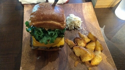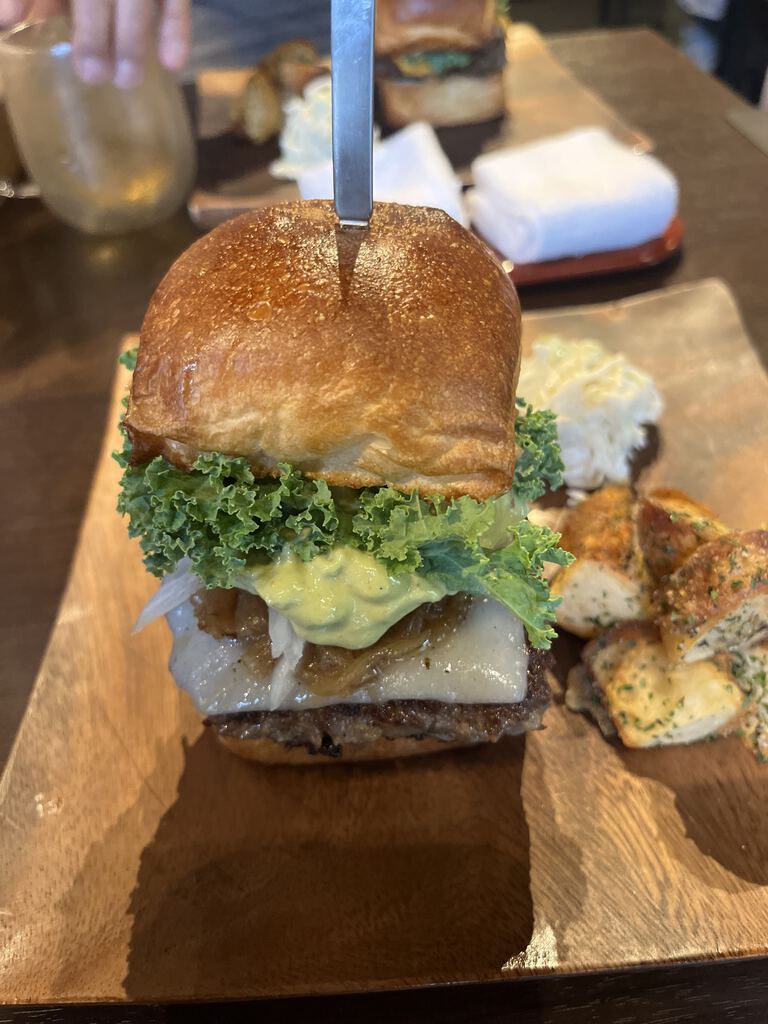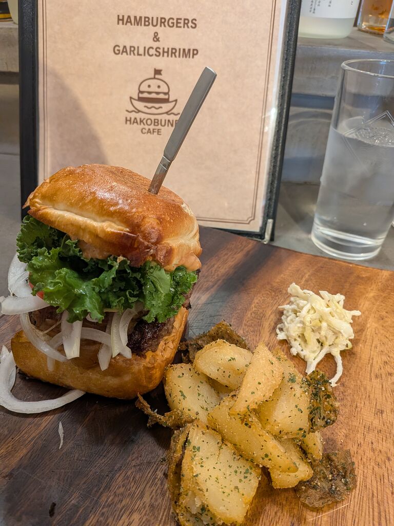 ボリューミーなハンバーガーをいただきました。テーブルに袋があるので、袋に入れて潰して食べるスタイルかナイフとフォークで食べることもできます。プレートには、大根のサラダと美味しいポテトもつきます。お肉がとてもジューシーで肉汁があふれます。バンズもおいしくて、かなりのボリュームでしたがペロリと完食。次回はデザートメニューも食べに行きたいです。 (訪問:2025/10/11)