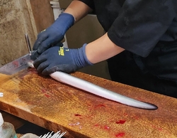 当店ではご注文後に、生簀から活うなぎを取り捌きます。お客さまにはすべての工程をご覧いただけます。捌いた直後の心臓や肝吸いをご提供。一色産の大きな脂ののった身は厚く、食べるとふわふわ柔らかい。ぜひ一度、美味しいうなぎをご賞味ください。