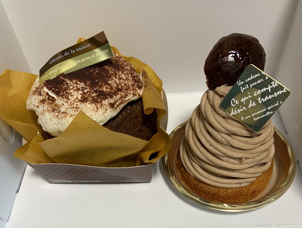 ティラミスとモンブランを購入しました。ティラミスは、コーヒーシロップがしみこんだスポンジ生地の上にクリームが乗っています。モンブランは、フィナンシェのような土台の上のマロンクリームが滑らかで濃厚です。どちらも斬新な食感に驚きました。焼き菓子類も販売されていたので、次回はこれらも併せて購入するつもりです。 (訪問:2025/10/20)