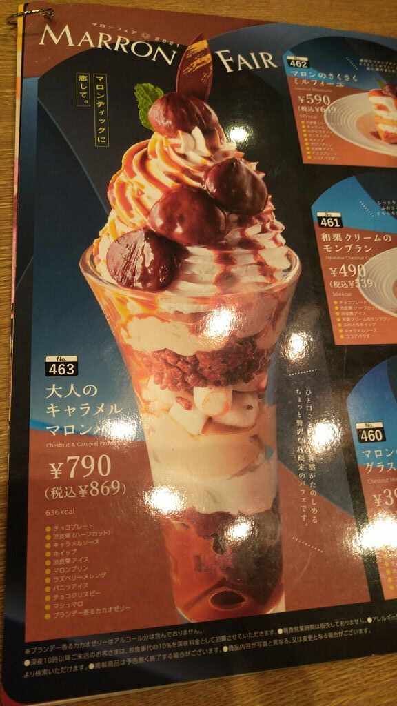 緊急事態宣言が緩和され、営業時間が延長されていたので22:00過ぎに来店しました。既に夕飯を済ませていたので、デザートとドリンクバーを注文しました。ココスと言えばフェアのパフェかなと思い、秋の味覚、栗を使ったパフェ「大人のキャラメルマロンパフェ」を頼みました。カカオゼリーやマロンプリン、バニラアイスなど沢山詰まっていてとっても美味しかったです。甘い中にもほろ苦で大人な味もありキャラメルソースや上に乗っかった栗など、贅沢な味わいでした。呪術廻戦とのコラボ商品もあるようなので、またうかがいたいです。 (訪問:2021/10/25)