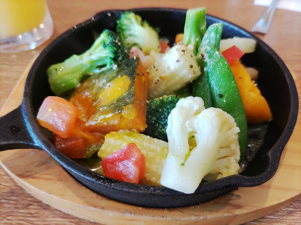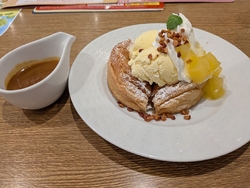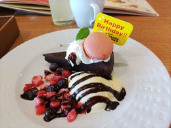 お月見のフロマージュモンブラン・温野菜のシーザーサラダ・ドリンクバースープバー付き・バースデーデザートをいただきました。ココウェブに会員登録すると、お得なクーポンをいただけるのですが、なんと言ってもぴか一なのが、バースデーデザート無料のクーポン。無駄にしては絶対損なので混雑覚悟で日曜日のランチタイムにお邪魔しました。混んでいるのに、短時間での提供はさすが。温野菜のサラダはボリュームもありおいしかったです。お月見のフロマージュモンブランも、ボリュームあるし美味しい。ドリンクバーも豊富だし、スープも和洋2種類あっておいしかったです。でもなんと言ってもイチオシなのはバースデーデザート。無料です。見て嬉しい食べておいしい。しかもお財布にも優しい。休日でもお店も駐車場も広いし、店内では配膳ロボたちが頑張っているので待ち時間は短いです。年ごとに重くなるだけの誕生日ですが、楽しみができました。 (訪問:2025/09/07)