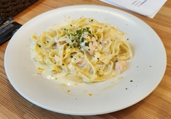 NEW2025年11月1日オープンのフレンチのお店に初訪問。フレンチだけでなくイタリアンも食べられるようです。注文は私が「エビとカラスミのペペロンチーノ スパゲッティ 1,380円」友人が「和牛のボロネーゼ温玉添え フェットチーネ 1,380円」「レモン香るサーモンクリーム フェットチーネ 1,380円」3人とも「ジンジャーエール 500円×3」大好きなエビにペペロンチーノ。ピリ辛で美味しかった。 (訪問:2025/12/06)