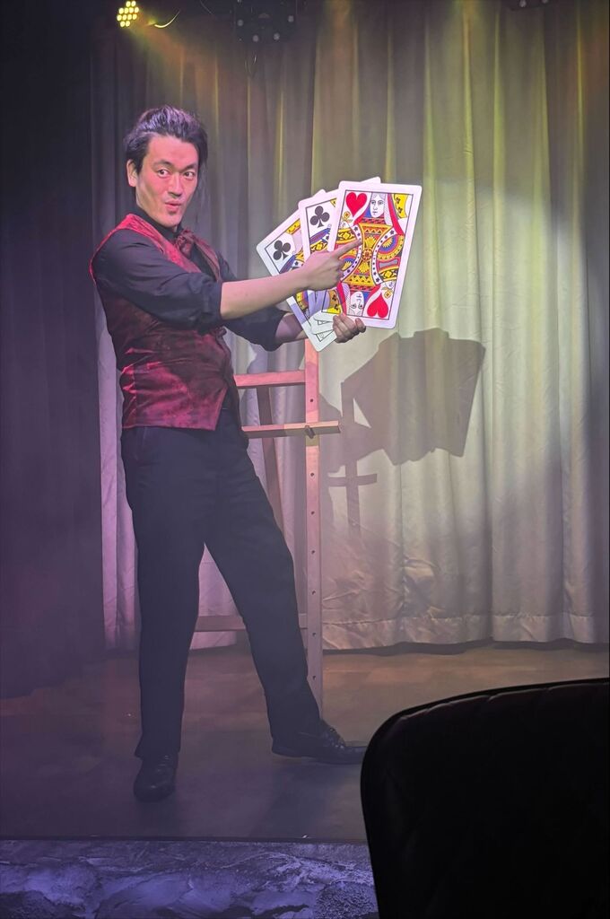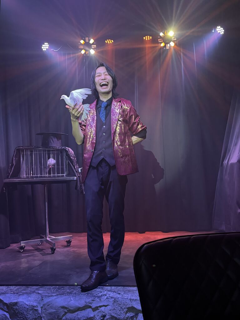 お酒やソフトドリンク、食事を楽しみながらマジックショーが見られる新感覚のテーマパークレストランです。夫がたまたま入場料無料のチラシを持っていたことがきっかけで、予約をして家族で伺いました。1ドリンク・1フードオーダー制です。メニュー表を見てワクワク♡特にオニオンリングがインパクト大でした!!そして、どれもおいしかったです♪マジックショーはお手伝いありの参加型。驚きと笑いの連続で、プロならではのテクニックに魅了されました!至近距離で鑑賞できたのも嬉しかったです♡子どもから大人まで楽しい時間を過ごせるアットホームな雰囲気のお店です。予約して、ぜひ行ってみて下さい!(パフォーマーさんの写真・動画はSNS掲載OKとショーの前に説明がありました。) (訪問:2025/11/22)