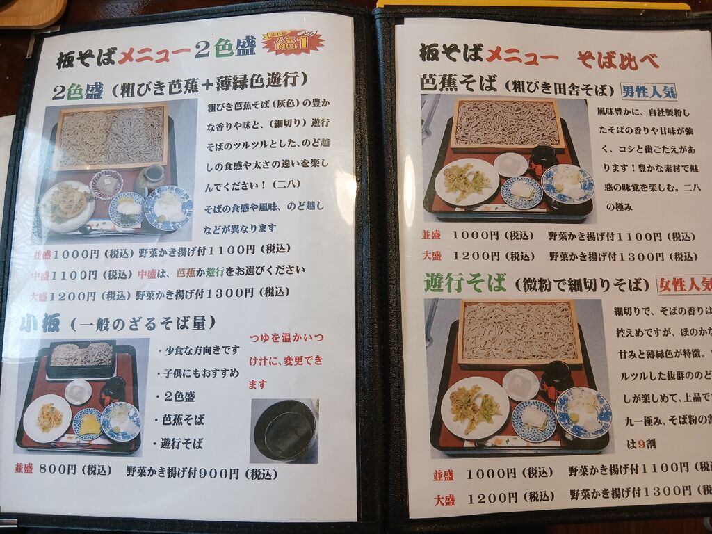| 板そば2色盛 | 1,000円 中盛+100円 大盛+200円 かき揚げ付+100円 |