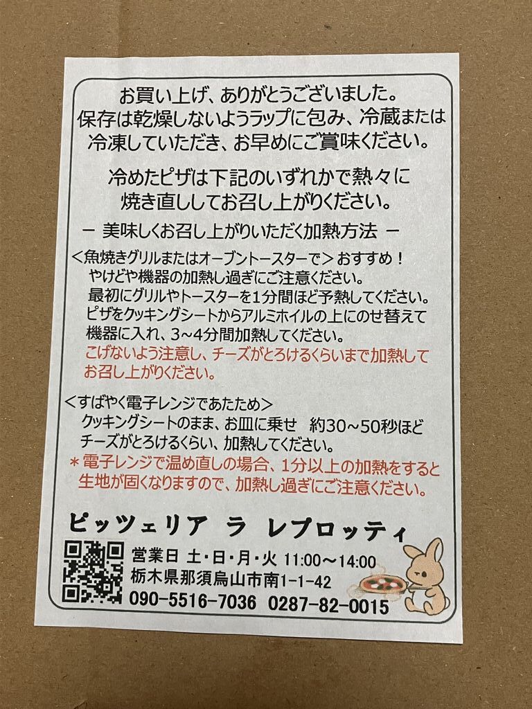 以前から気になっていたこちらのお店。テイクアウト専門店とのことで、なかなか伺う機会がありませんでしたが、職場でまとまった数を注文するというので、私も一緒に頼むことにしました。せっかくなので、色んな種類を一度にいただける「クアトロミックスピザ」をお願いしました。箱には美味しい食べ方が丁寧に記載されていて、期待がふくらみます。帰宅後、説明書きのとおりトースターで温め直してから、夕ごはんにいただきました。マルゲリータ那須の森、生ハム、ナスとベーコン、ツナマヨコーンと、4種類の味が1枚で楽しめます。…が、マルゲリータが好きな息子さんに、マルゲリータと生ハムを食べつくされてしまいました…。私は、ナスとベーコン、ツナマヨコーンを一つずついただきました。もっちりとした生地は小麦の香りが香ばしく、トマトソースも美味しい~。とろけるようなナスの食感と、とろ~りチーズの組合せは間違いありません。ツナマヨコーンも、たっぷりコーンが美味しかったです。生地は栃木県産ゆめかおりと帰農志塾さんの有機無農薬の小麦を使用、ピッツァソースも地元産の食材を使用した手作り。チーズも那須の森のモッツァレラチーズを使用する等、材料にもかなりこだわっていらっしゃいます。次回は3種類あるマルゲリータの食べ比べをしてみたいです。美味しい幸せをありがとうございました。ごちそうさまでした~。 (訪問:2025/12/02)