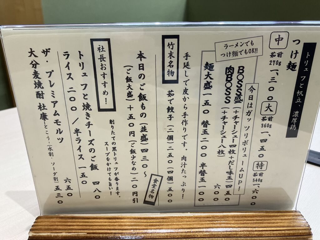 小山竹末食堂さんには初めて伺いました。平日の13時過ぎでしたが、流石に竹末食堂は有名店なので満席でした。トリュフと帆立濃厚鶏つけ麺(大盛り)と茹で餃子を注文。麺にはトリュフオイルが掛かっているので、麺だけで食べてもふんわりトリュフが香りつるもち食感の麺の美味しさが楽しめます。次につけ麺の濃厚鶏をしっかり味わい、帆立ペーストを追加でさらに味変、卓上に刻みニンニク、辛味だれも有りますので食べ進めながら自分好みに変化出来るのも良いです。麺大盛りは茹で前370g有るので、食べ応え十分でした。 (訪問:2025/12/26)