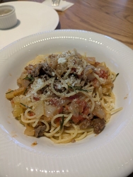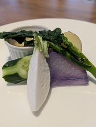 NEW2025年11月1日に道の駅どまんなかたぬまにオープンした山形県鶴岡の「アル・ケッチァーノ」の奥田政行オーナーシェフ監修のイタリアンレストランです。早速、友人らと伺いました。入り口にある受付機にて番号札を発券して順番を待ちます。店内にも待合所があり10分くらいで順番が来ました。注文はテーブルでタブレットから行います。4人とも【選べるパスタセット(1680円税込)】にしてアーリオオーリオペペロンチーノ、ベーコン玉葱アマトリチャーナ、地鶏とキノコのボスカイオーラ+200円を選びました。前菜としてバーニャカウダが提供されます。サラダでは出てこない里芋などの温野菜です。道の駅内でこのような本格イタリアンを食べられるのは幸せです。 (訪問:2025/11/16)