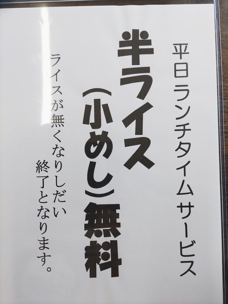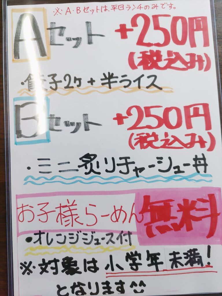 | セットメニュー(平日ランチのみ) | Aセット(餃子2ケ+半ライス)+300円 Bセット(ミニ炙りチャーシュー丼)+350円 |