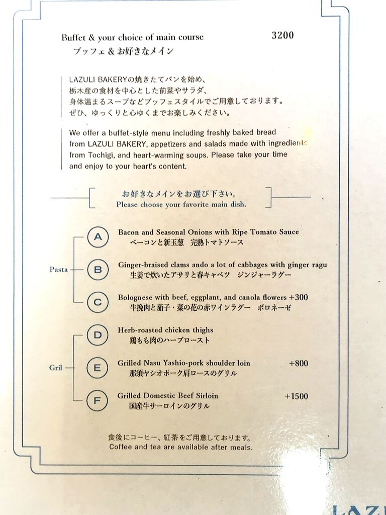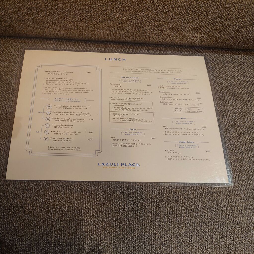 NEWこの前にパンを買いに来た時に素敵な雰囲気だと思ったレストランへ初訪問です(*^^*)。。。ここは“THE KNOT UTSUNOMIYA(ホテル)”さんの 1Fにある「LAZULI PLACE」さんです(^o^)/。。。少し照明を落とした感じの店内はシックで落ち着いた雰囲気で素敵です(*´∀`)♪。。。レストランは、Morningに始まりLunch〜Cafe〜Dinnerへと“朝から夜まで、街の一日をゆるやかにつなぐオールデイレストラン”がコンセプトだそうです(^o^)v。。。オーダーはテーブル上のQRコードからメニューを見てスマホで注文ををします。ランチには“ブッフェ ”、“コース” 、“セット ”の三タイプがある様ですがメインをパスタから【パンチェッタとじゃが芋 鹿沼産ニラジェノベーゼ】をチョイスしブッフェで頂きました(*´ω`*)。。。ブッフェは多彩なサラダ〜パン、ドリンク、デザートやフルーツ等と彩り豊かで、パスタもボリューミーでとても美味しかったです(*´ω`*)。。。営業時間は、モーニング(7:00~10:00(L.O. 9:30))、ランチ(11:00~15:15(ブッフェ L.O.13:15,コース L.O.13:45,セット L.O. 14:15))、カフェ(15:30~17:00)、ディナー(17:00~23:00)となっています。ご興味のある方は時間にご注意下さい(*^^*)。。。厳然された食材と地元の美味しい食材で作られた美味しい料理!素敵な雰囲気を楽しめる「LAZULI PLACE」さん!一日を楽しめるお勧めのオールデイレストランです( ^-^)ノ∠※。.:*:・'°☆ (訪問:2026/02/02)