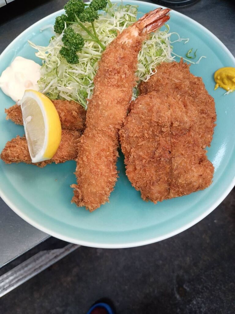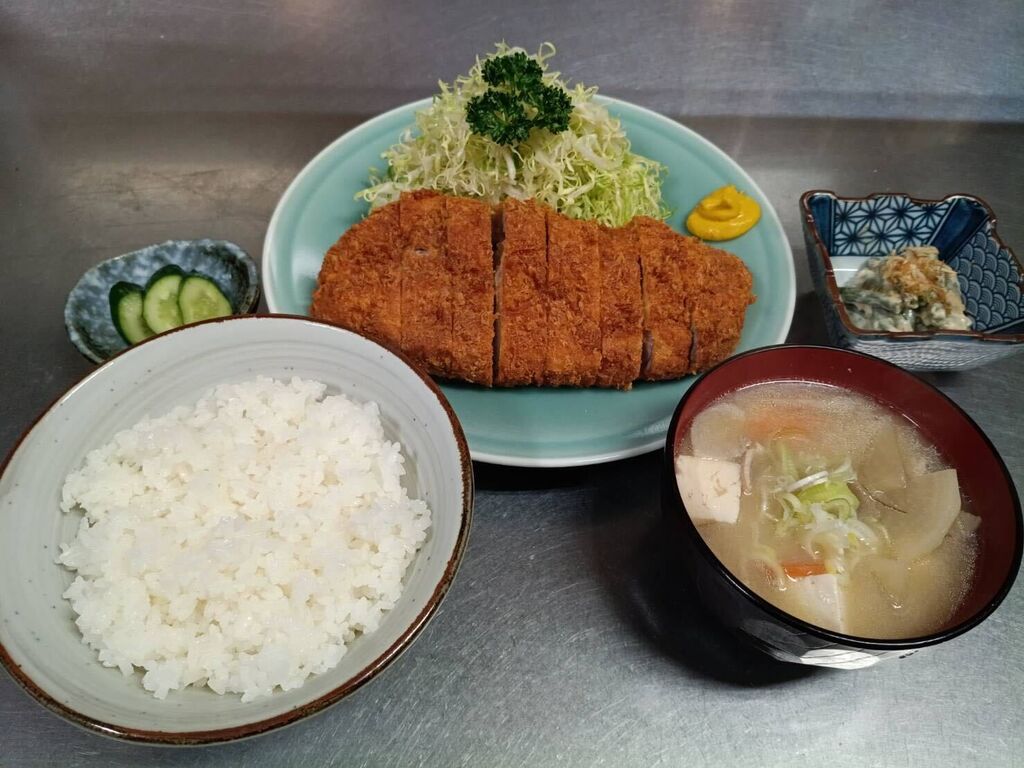 とんかつが食べたくなりGoogleマップで検索して辿り着きました。カワチの裏なので、存在を知らない方が多いのかも。ランチは日替わりで揚げ物以外やお魚もある様子。ロースカツ定食と海鮮ミックス(カキ2、エビ1、白身魚1)を注文。プラス料金でお味噌汁→豚汁に変更できるそうですが、口コミで「ボリュームが多く変更しなくて良かったかも」というのを見ていたため、しませんでした。シェアしながら食べましたがカキフライ1個がすごく大きくて、先日食べた小さいカキフライ2個分くらいあるな、、と。普段から同年代と比べて量を食べる方で、母と一緒なので1人分+α食べたのもありますが、かなりお腹が苦しくなりました。とんかつは塩コショウが結構効いてます。でも本当に美味しかったです。50年以上続いているお店のようなので、これからも続いてほしいなと思います。 (訪問:2025/11/23)