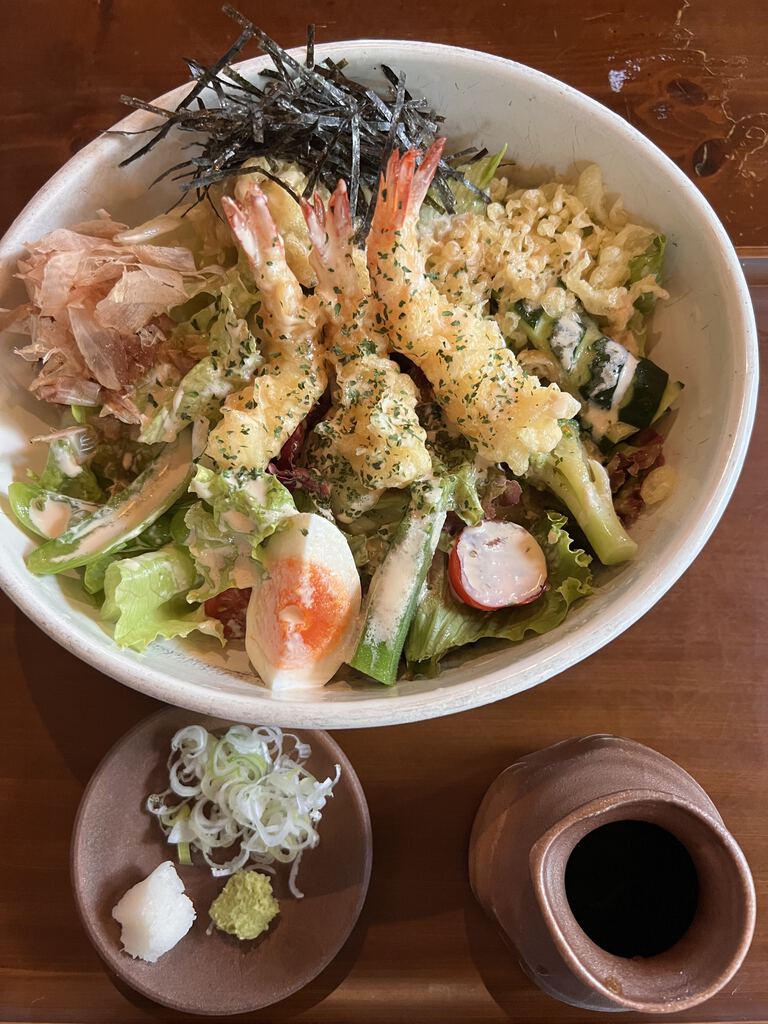 小海老のマヨサラダ ¥1080レタス、ブロッコリー、オクラ、ミニトマト、キュウリ・・・沢山の野菜と天ぷらがのってそこに麺つゆと薬味を入れてサラダそばの出来上がり最後のつゆまで飲み干す美味しさ♡美味しかった(˶ᐢᗜᐢ˶) (訪問:2025/07/16)