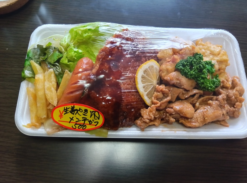 お昼にメンチカツ、焼肉、唐揚げ、ソーセージがセットになったお惣菜を購入しました。ボリューム・お値段とも満足な一品です。 (訪問:2025/12/17)