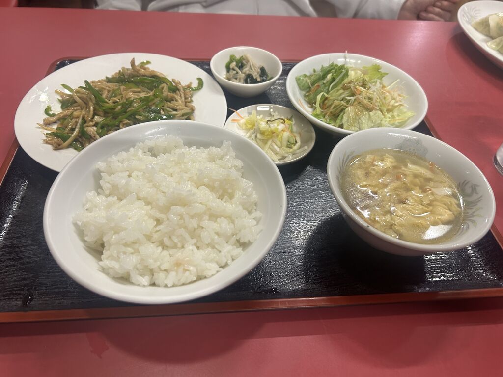うまか丼990円税込みを注文しました。お新香(ハクサイ、ダイコン、昆布、ニンジン)、サラダ(トマト、サニーレタス、ニンジン、カイワレ大根、ダイコン、キャベツ)、和え物(クラゲ、キュウリ、キャベツ)、鶏ガラの効いた中華スープ付きです。丼は豚肉、シメジ、ピーマン、ネギ、キクラゲのピリ辛炒めで自家製の豆板醤と甜麵醬が味を整えております。豚肉とシメジが豊富に入っていてゴハンの盛りが良く食べ応えがありました。 (訪問:2024/03/24)