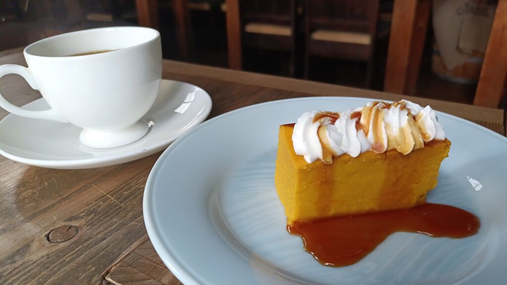 店内は薄暗く、照明が控えめで自然の光が強調されている落ち着いた大人の雰囲気&空間‿❀°自然と一体感になれる静かな空間でもありコーヒーを片手に物思いに耽る時間を過ごすのに最高な場所かも(笑)食後のデザートTime♬【かぼちゃのケーキ】と【タンザニヤ・キリマンジャロ】に決定~٩( ᐛ )وシナモンが効いたかぼちゃのケーキはずっしりとコクがあり上品♪かぼちゃの甘さを生かしていて、生クリームの甘さに邪魔されていなくてバッチリ(*•̀ᴗ•́*)و ̑̑ほろ苦いカラメルソースも合っていて完成された味でファン確定(笑)甘い香りに ふんわり苦味を感じるキリマンジャロは私的に飲みやすく空間とともに癒された気分になっちゃったぁ~(笑)ミニコンサートが出来るステージ&グランドピアノがあり、コンサートの写真なども飾ってありました。庭も綺麗に手入れされていて窓越しにボーッと眺めていられるほど居心地良い時間を過ごしちゃいました。出来れば秘密にしておきたい穴場かもしれませんね(笑) (訪問:2026/01/05)