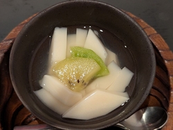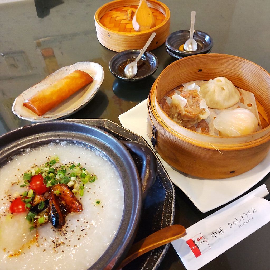 点心ランチB(サラダ、点心4つ、主食、ミニデザート)1800円を注文。小籠包は肉汁たっぷり、焼売は少し甘辛い味付け、海老餃子は皮がモチモチ、春巻はサクサク&具だくさんでした。選べる主食はお粥を選択、土鍋に入ってあっつあつで登場です。ミニトマト、揚げナス等の具がカラフルで見てるだけで食欲をそそります。とろっとしたお粥は胡椒のパンチが効いています。お店が混んできたので席数コントロールのために移動したところ、サービスでジュースをいただきました。ごちそうさまでした。 (訪問:2025/10/07)