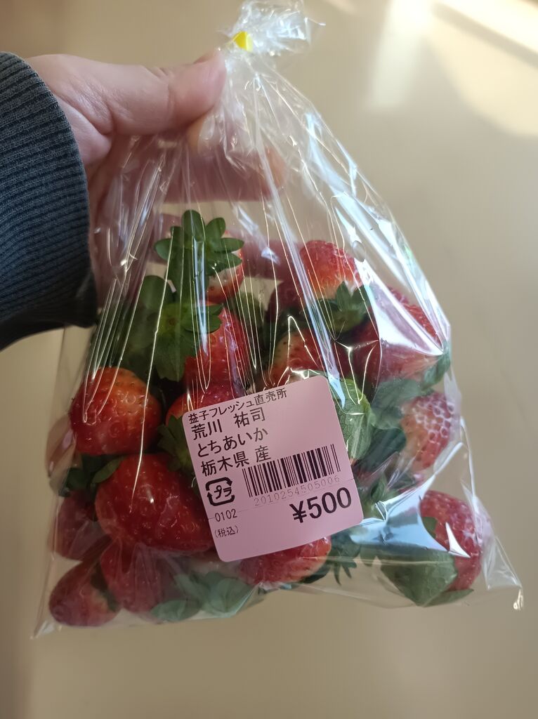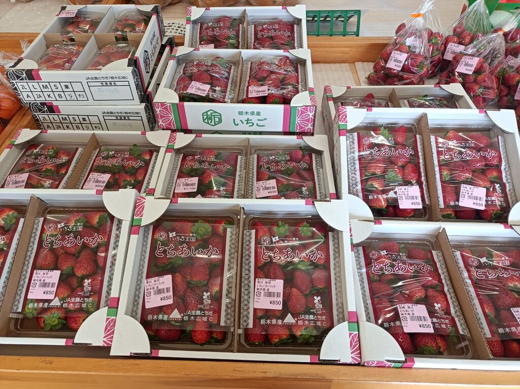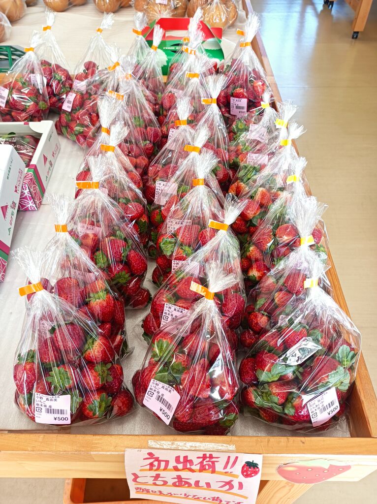 いちごがたくさん販売されていました!パック売りやお徳用の袋のいちごが並んでいました。品種はとちあいからしく、初出荷と書いてあったので500円のいちごを1袋購入してみました。袋のいちごは形が不揃いというだけで、パックのいちごと味も量も変わらないそうです!とーっても甘くて美味しかったです!!自宅で食べるなら、袋で充分です☆ (訪問:2025/11/08)