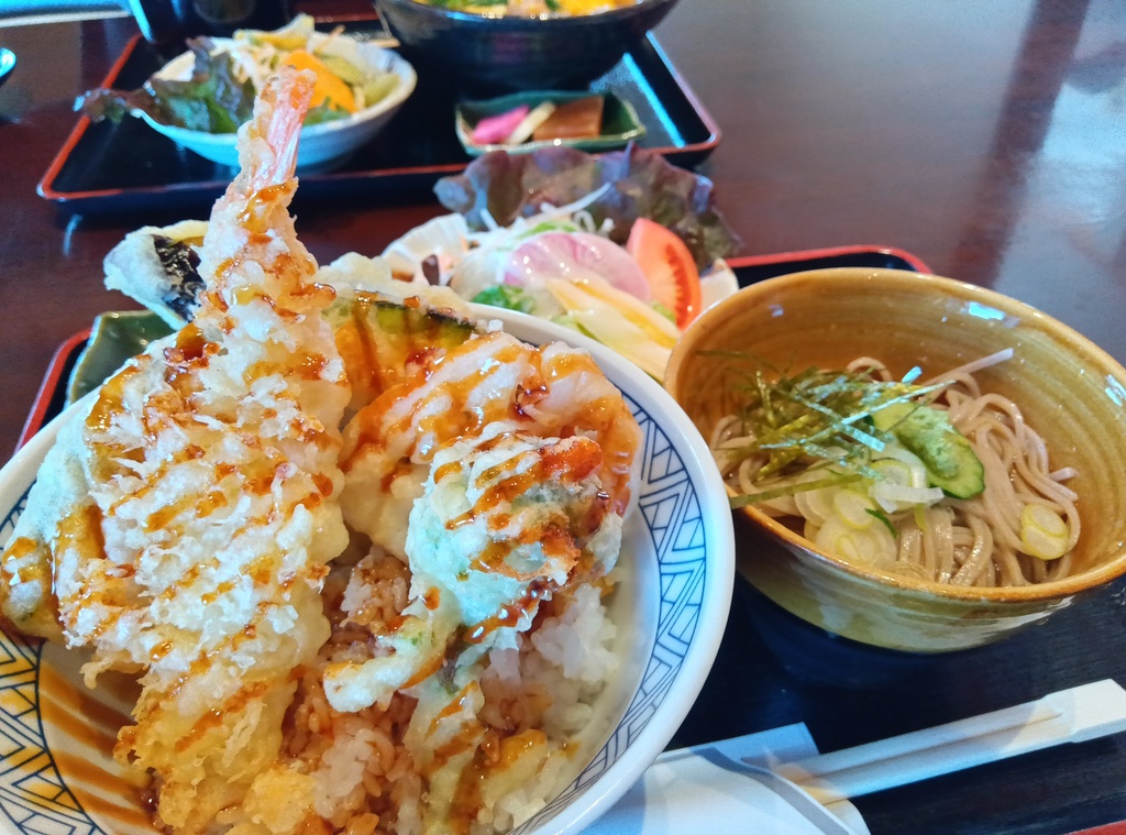 | 気まぐれランチ(天丼メインで、+そば または うどん +サラダ・香の物) |