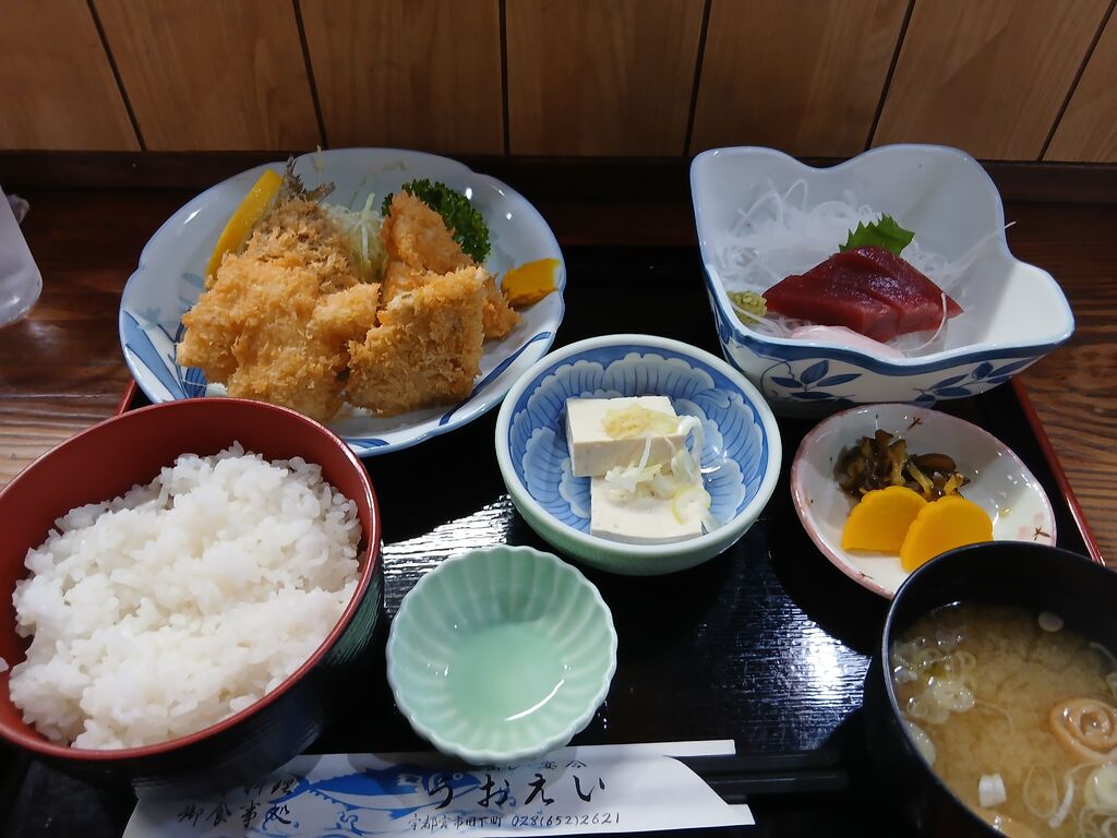 今日は、木曜日の平日ですが、近くの温泉に入って来てから、食べに来ました。いつもこのお店に来ると、ランチに目が行ってしまいます。今回は、ミックスフライと刺身セットを、食べて来ました。ミックスフライは、揚げたてで、アツアツサクサクで、とてもうまかったです。そして、刺身、冷奴と付いていて、とてもうまかったです。ごちそうさまでした。 (訪問:2025/10/16)