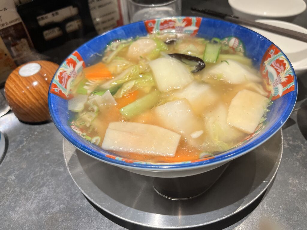 18時前に伺いましたが、混んでいました。「中華風サラダ」「酢豚」「五目チャーハン」「海の幸麺」をいただきました。お味もよく、どれもおいしくいただきましたが、中でも「海の幸麺」は驚きました。大きな帆立とプリプリの海老が贅沢に2つずつ入っていて、テンションあがりました。火入れ具合も絶妙。またこちらを食べに伺いたいです。 (訪問:2025/12/06)