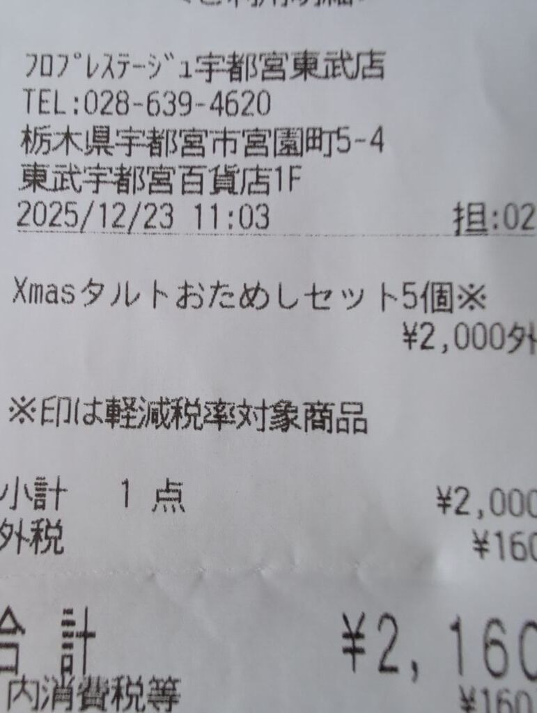 クリスマスのスイーツを受け取りに来る方も多い中、実家へ持っていくのにタルトのお試しセットを購入しました。フルーツタルト3つとイチジクのタルト、チーズタルトの5個入りです。実家にいた姪っ子も一緒にお昼前にパクリ、残った1つは姪っ子にお土産で持たせました。フルーツタルトは少しずつ果物が違っていましたがどれもフレッシュで美味しくてみんなに喜ばれました。 (訪問:2025/12/23)