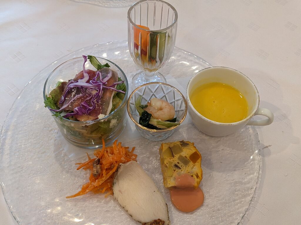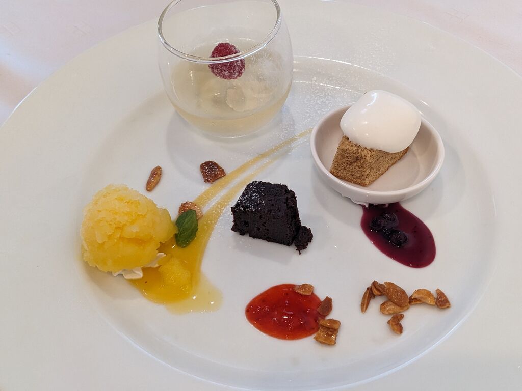 安定の美味しいお料理がいただけるお店へ。プリフィックスランチAを注文しました。オードブルからとっても豪華。美しいお皿に綺麗な盛り付け。サラダやスープ、人参のラペなど、多種盛りでどれも美味しいです。選べるメイン料理はたくさんあり、定期的に変わるのも楽しみ。今回は若鶏モモ肉のパン粉焼きトマトソースにしました。鶏肉の焼き加減が絶妙で、ソースも濃厚で美味。最後に豪華なデザートプレートに選べるドリンクが付き、今回も幸せなランチとなりました。 (訪問:2025/09/20)