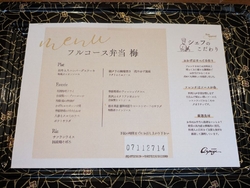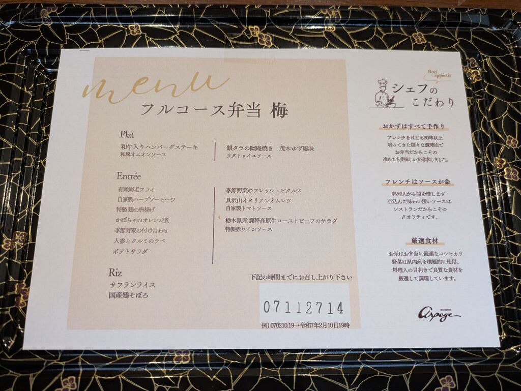 お弁当をいただきました。お弁当ながらフルコースとは贅沢です。和牛入りハンバーグステーキ、有頭海老フライ、銀タラの幽庵焼きなどおかずが豪華で、手作りならではの美味しさを感じました。彩りも素敵で、肉も魚も野菜もとても鮮やかです。おかずごとに添えられたソースが絶品で、料理をより美味しく引きたたせてくれました。お弁当とは思えないほどの満足感を得られとても嬉しかったです。 (訪問:2025/11/27)