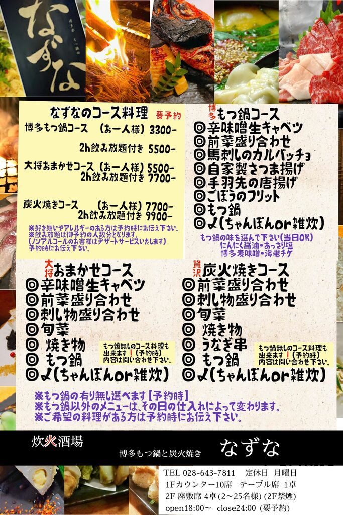 料理のみ 5,500円/人 2h飲み放題付き 7,700円/人 [もつ鍋の有り無し等、料理内容は、ご希望合わせてメニューを変更可能です。] [ご予約時にお伝え下さい。] (要予約)(税込み) |
