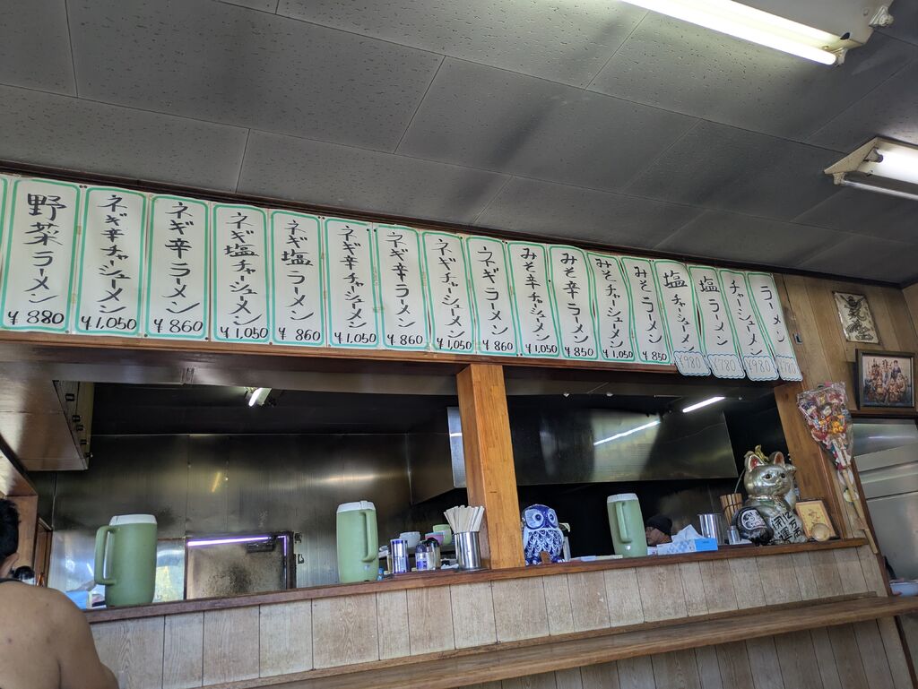 たまたま小山市に行った時に、並んでいるお客さんがいたので、入ってみました。ネギラーメンが人気のようでしたが、ネギの入荷がないのかネギラーメンは食べられませんでした。ラーメン(醤油)と野菜ラーメン(塩味)と揚げ餃子を食べました。太麺でスープは濃いめでした。チャーシューがおいしかったです。揚げ餃子は、少し脂っこかったので、普通の餃子の方がいいなと私は思いました。 (訪問:2025/09/06)