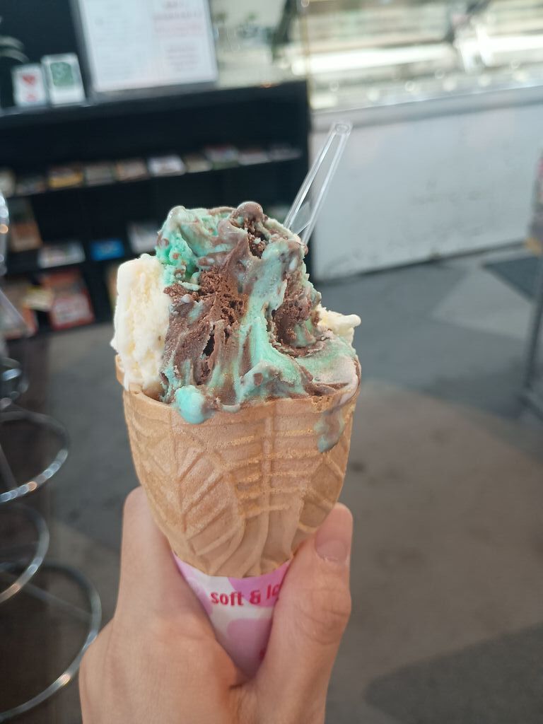 あまりにも早く食べた過ぎて、写真を撮るのを忘れて数分…食べかけの写真になってしまいました。2セレクトのコーン、味はプレミアムバニラと生チョコミントです。少し肌寒い日でしたが、かえって溶けることもなくゆっくりと楽しむことができました。お味は言わずもがなの美味しさ!久しぶりの訪問でしたが、また次に訪れるのが楽しみです。 (訪問:2025/09/20)