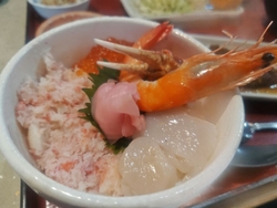 久しぶりの訪問。11時開店ですが10:40に到着。平日とあり1番でした。以降、開店前に並んだ客は二組。しかし開店30分でほぼ満席の人気店です。頼んだはmini函館海鮮丼セット、海鮮丼プラスカニクリームコロッケ、串に刺さったステーキ、デザートが付来ます。お値段3000円超えますが奮発しました。海鮮丼はミニだから仕方ないが普通の海鮮丼の方がオーと言うボリュームはあります。カニが多いのがオーですがそぼろ的に一気に食べ終わり、イマイチ物足りなさがありましたがカニクリームコロッケとステーキが補いお腹一杯なりました。私的には函館ミニ海鮮丼よりカニクリームコロッケ、串ステーキに大満足でした。海鮮丼でボリュームを追求するなら普通の海鮮丼、色々楽しみたいなら函館ミニ海鮮丼セットをお勧めします。美味しそうなメニューばかりで迷う人気店です。 (訪問:2025/12/10)