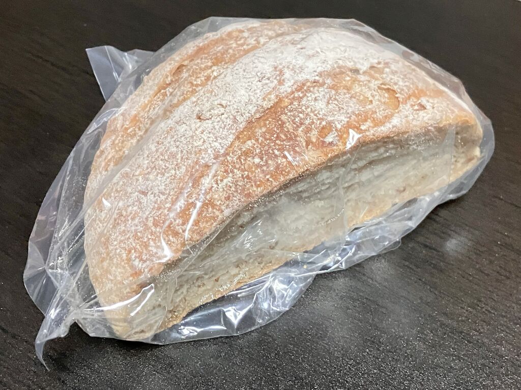 3連休の最終日、またまたストック用のパンを購入するために伺いました。その日の営業状況は必ずホームページをチェックしたから伺うのですが、この日は「絶好調」との記載があり、わくわくしながら伺いました。一部品切れのものもありましたが、お目当ての「ライ麦60%レーズン・オレンジピール・くるみ580円」は無事確保。「新作」との表記があった「粗挽きライ麦全粒粉380円」も気になって購入です。焼き立てだったので紙袋に入れてもらいましたが、ずっしりと重くて袋が破けそうでした。帰宅後、さっそく夕ごぱんに粗挽きライ麦全粒粉をいただきました。スライスしてトースターでリベイクしてからいただくと、バリっとした外側の固さ、もちっとした内側の生地が何とも言えない美味しさ。ライ麦独特の酸味も感じられ、次回も購入間違いなしです。一度には食べきれないため、残りは1食分ずつカットして冷凍することに。またストックが無くなる前に伺いたいと思います。美味しい幸せをありがとうございました。ごちそうさまでした~。 (訪問:2025/11/03)
