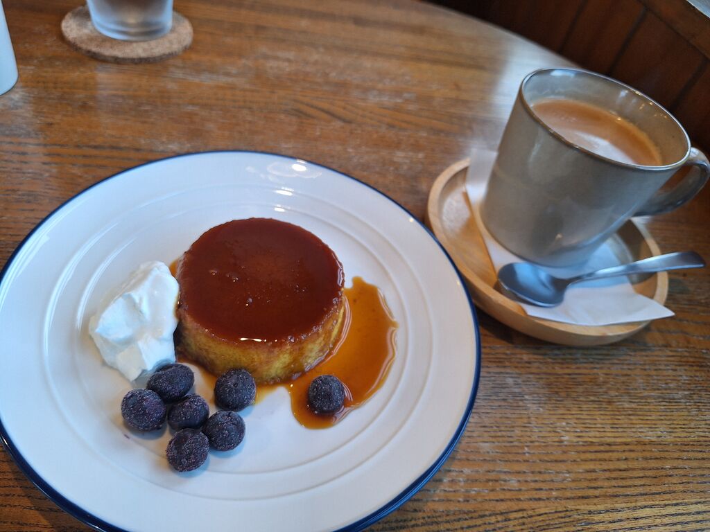 ゆっくり本を読みたく17時過ぎにお邪魔しました。ショウケースにあるスイーツがどれも魅力的でなかなか決められず…。『かぼちゃのプリン450円』『チャイ600円』をチョイス。濃厚なかぼちゃプリンは大きく食べ応えたっぷりで嬉しい。ビターなカラメルとカボチャの甘味たっぷりのプリンが絶品☆チャイは大きなカップにたっぷりで、スイーツのお供も、本のお供もバッチリこなしてくれるサイズ感。スパイスがほどよく効いたお味で万人に受けそう♪体もポカポカしてくるので、これから気温が落ちてくると人気でそうです!入店前に出会ったニャンコさん。寝ていたところをパチリしようと、恐る恐る静かに近づきましたが、野生の感がスゴいのか、パチッと目を開けてしまい…、寝てるのにニャンだ?と言わんばかり。起こしてごめんなさいですが、かわいいお出迎えに大興奮でした^^ (訪問:2025/09/07)